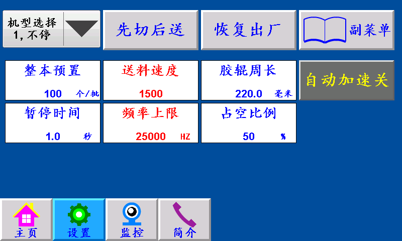 四、设置 不停/暂停/停机:“不停”:一批结束主机不停,继续正常工作。 “暂停”:一批结束主机暂停,停到暂停时间结束,主机自动开机。 “停机”:一批结束主机自动停机后不再运行,手动按启动键方可运行。 “空切”:一批结束主机继续空切,脱袋滞后时间结束后继续送料。 先切后送/先送后切:“先切后送”:按启动键,主机先运行,GK1霍尔开关检测到伺服(步进)电机的送料信号,伺服(步进)电机开始送料。 “先送后切”:按启动键,伺服(步进)先送料,送料结束后主机再运行。 恢复出厂:按此键恢复出厂设置(慎用)。 副菜单:点击此键进入副菜单界面。 整本预置:一批设定的个数,提前5个报警。单位:个 送料速度:伺服(步进)电机的加减速时间,设定越大,伺服(步进)电机起步越快。 胶辊周长:伺服(步进)电机带动橡胶辊转一圈的长度。