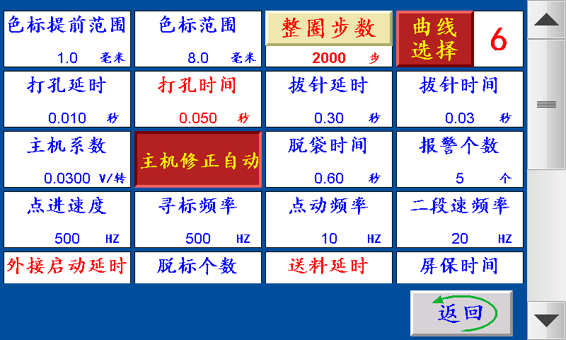 五、副菜单 色标范围:制作彩色制品时,伺服(步进)电机以恒定的速度寻找色标点的范围(即色标光电在『长度—设定的色标范围长度』范围内寻找色标,寻至『长度+设定的色标范围长度』。 色标提前范围:制作彩色制品时,伺服(步进)电机在料送结束之前,提前以恒定的速度寻找色标。 打孔延时:送料结束后延时此参数设定的时间后打孔信号输出。 打孔时间:伺服(步进)电机转结束,打孔电磁阀工作的时间。 拔针延时:一批结束后延时此参数设定的时间后拔针信号输出。 拔针时间:一批结束后延时“拔针延时”的时间后拔针信号输出,跟脱袋信号一起断开。 横吹百分比:由输入点X01送料信号控制横吹信号输出,输出时间由此参数来设定调节。 竖吹时间:由输入点竖吹输入控制竖吹信号输出,时间由此参数来设定调节。 脱袋时间:一批结束后延时“拔针延时”加“拔针时间”的时间后脱袋信号输出,时间结束后跟拔针信号一起断开。 报警个数:一批结束前提前N个报警。 点进速度:伺服(步进)电机的点进/点退时的速度,设定越大,伺服(步进)电机的转速越快。 寻标频率:伺服(步进)电机追色标时的速度,设定越大,伺服(步进)电机的转速越快。 点动频率:停止状态下,X04(点动)收到信号时,Y07主机信号输出,切刀上下运行,速度由此参数调节。 二段速频率:主机运行时按停止键,主机切换成二段速?;嗡偎俣扔纱瞬问鹘?。 外接启动延时:点击外接启动按钮时,持续该时间后主机开始启动。 脱标个数:设定N个,制作彩色制品时,跟踪N次色标点,跟踪不住自动停机。 送料延时:下一次送料时,延时送料延时时间后开始送料。 屏保时间:主机运行状态下,在主界面停留此时间进入屏保状态。(设置0则屏保无效) 烫压时间:遇到烫压信号,主机信号关闭的时间。 总数?;鍪鹤苁;柚酶鍪苁酱锷瓒ǜ鍪蓖;?。 ?;厮醭ざ龋好看瓮;?,送料往回缩的长度 停机空切个数:每次停机时,主机需要空切的次数。 辅助百分比:辅助信号与送料同步,由送料长度的百分比提前结束辅助送料信号。 整圈步数:伺服(步进)电机转一圈所需要的脉冲个数。 曲线选择:1~9,步进电机默认1,伺服电机默认6 主机系数:控制主机速度快慢。 主机修正手动/主机修正自动: 主机修正手动:手动调节主机系数来改变主机速度 主机修正自动:自动修正好主机速度对应的主机系数大小。