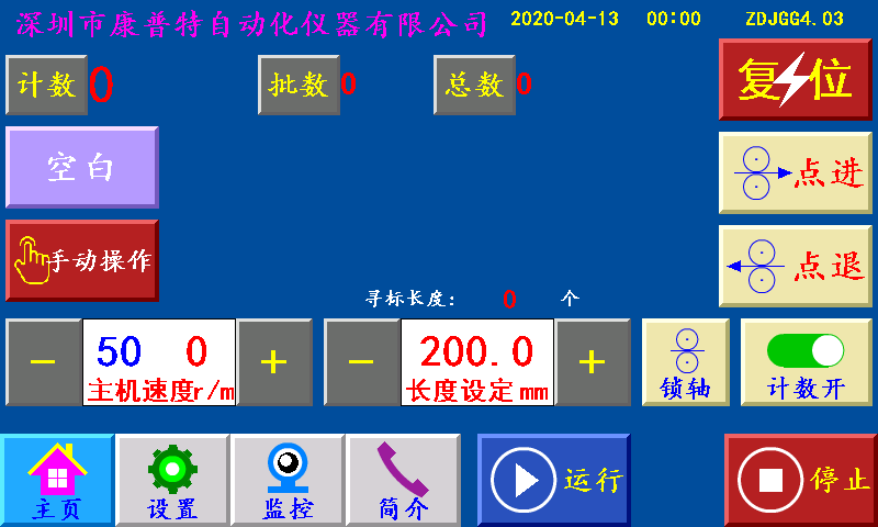 三、主页 长度设定:显示制袋所设定长度,单位:毫米(也可以当按键直接调节长度) 主机速度:控制主机加减速快慢。 锁轴/松轴:松开/锁住电机轴承 计数开/计数关:控制每次送料是否需要计数。 计数/清零:单批次累计到一批个数结束时,个数自动归零;按“计数/清零”键清零清个数。 批数/清零:一批结束后,批数加“1”, 总数/清零:个数每加一个,总数加“1”;按“总数/清零”键清零总数。 空白/深色/浅色:三种状态切换。 空白:指光电忽略色标光电传感器信号; 深色:指跟踪印刷制品时,以深颜色的色标点为跟踪点; 浅色:指跟踪印刷制品时,以浅颜色的色标点为跟踪点。 寻标:当‘寻标’键选择“深色/浅色”时按此键,伺服(步进)电机一直转到深色的色标点自动停转时,设置为“追深”;伺服(步进)电机一直转到浅色的色标点自动停转时,设置为“追浅。 当‘寻标’键选择“空白”时,按此键无效 点进:在停止状态下,手动伺服(步进)电机正转。 点退:在停止状态下,手动伺服(步进)电机反转,在运行状态下此键变为“补数”,按此键计数减1。 复位:系统不能正常工作时,按此键程序重新启动,也可以做紧急?;?。 运行:按此键,主机正常运行。(长按3秒左右) 停止:按此键,霍尔开关GK1检测到高位?;藕牛恢骰远;?/span> 状态显示:运行/停止/超速/暂停/脱标/完料,六种状态切换显示。 运行:按启动键后显示“运行”。 停止:通电后一直显示“停止”。 超速:主机速度过快步进(伺服)电机送料还没有结束时,主机停机显示“超速”。 暂停:当机型选择“暂?!笔币慌崾;鶱秒后主机自动开机。 脱标:在制作印刷制品时没有跟踪到色标点显示“脱标”。 完料:当主机运行,X15检测到断料信号时,蜂鸣器报警,主机?;?,显示故障“完料”。主机停止状态下X15检测到完料信号时,蜂鸣器报警,显示故障“完料”。(按“停止”清除故障)