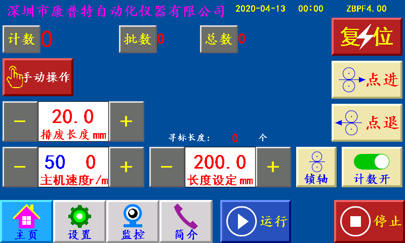 单次送料:停机状态下,点击此键,送一次料后停止。 空白/深色/浅色:三种状态切换。 空白:指光电忽略色标光电传感器信号; 深色:指跟踪印刷制品时,以深颜色的色标点为跟踪点; 浅色:指跟踪印刷制品时,以浅颜色的色标点为跟踪点。 寻标:当‘寻标’键选择“深色/浅色”时按此键,伺服(步进)电机一直转到深色的色标点自动停转时,设置为“追深”;伺服(步进)电机一直转到浅色的色标点自动停转时,设置为“追浅。 当‘寻标’键选择“空白”时,按此键无效 (注释:黄色按键在停机状态下,测试脚位是否正常) 七、放料设置界面