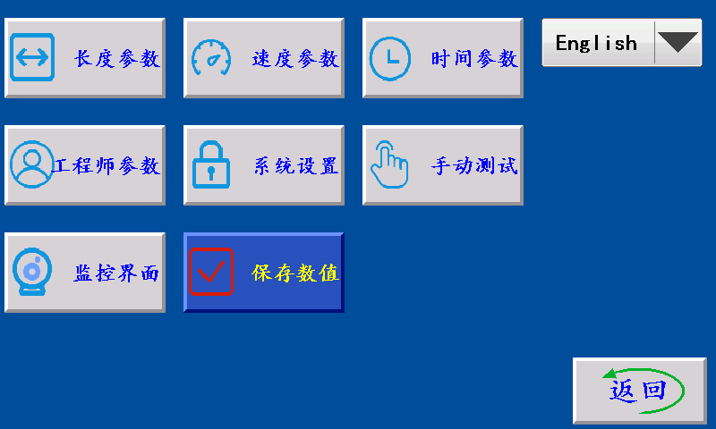 二、简介 ![]() English/中文:中文和英文界面切换按键。 长度参数:按此键进入长度参数设置界面。 速度参数:按此键进入速度参数设置界面。 时间参数:按此键进入时间参数设置界面。 工程师参数:按此键输入正确的密码,进入工程师参数设置界面。 系统设置:按此键输入正确的密码,方可进入。 手动测试:按此键进入手动测试界面。 监控界面:按此键进入监控界面。 保存数值:点击此键保存已设置数值。