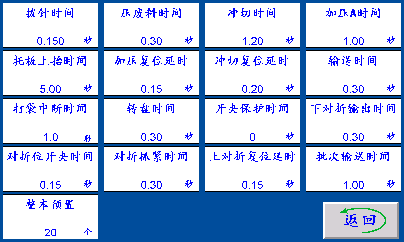 拔针时间:机械手前行距离结束之后,拔针信号输出拔针时间后机械手往冲切位移动。 压废料时间:机械手到冲切位后,压废料信号输出压废料时间。 冲切时间:压废料输出时间后,冲切信号输出冲切时间。 加压A时间:冲切输出时间后,加压A信号输出的时间后关闭加压信号。 托板上抬时间:托板上抬输出的时间。 加压复位延时:加压A信号关闭后,延时此时间后,冲切信号关闭。 冲切复位延时:冲切信号关闭后,延时该时间后开始对折或者后退拖料。 输送时间:机械手把料夹到输送带上后,输送信号输出的时间。 打袋中断时间:打袋暂时关闭的时间。 下对折输出时间:机械手移动到对折位时,下对折信号输出该时间。 对折位开夹时间:下对折信号输出时间后,机械手夹子打开的时间。 对折抓紧时间:机械手后退然后又向前移动到对折抓紧的位置,闭夹信号输出的时间。 上对折复位延时:上对折信号关闭后,延时该时间后,机械手后退松料。 批次输送时间:到达一批时,输送信号输出的时间。 开夹保护时间:运行时,夹子一直打开的时间超过保护时间后,机器停机。 整本预置:一批设定的个数,提前5个报警。单位:个