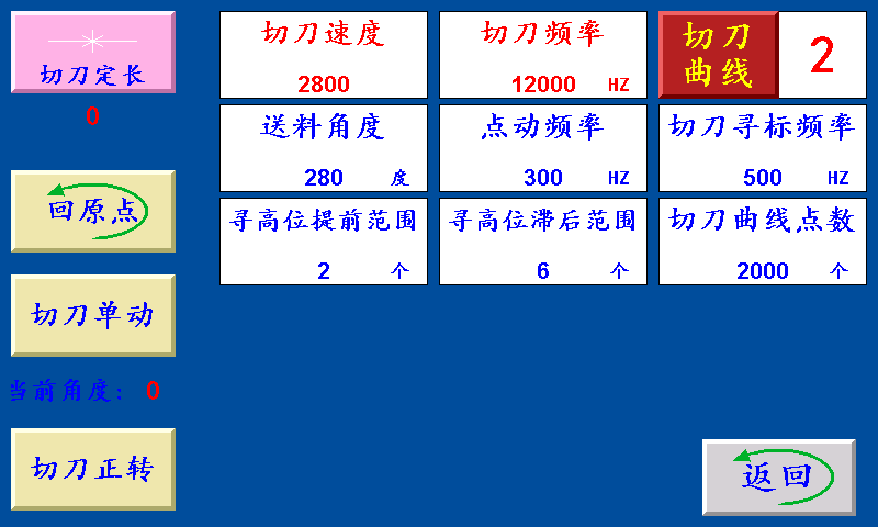 三、主页 长度设定:显示制袋所设定长度,单位:毫米(也可以当按键直接调节长度) 计数/清零:单批次累计到一批个数结束时,个数自动归零;按“计数/清零”键清零清个数。 批数/清零:一批结束后,批数加“1”, 总数/清零:个数每加一个,总数加“1”;按“总数/清零”键清零总数。 空白/深色/浅色:三种状态切换。 空白:指光电忽略色标光电传感器信号; 深色:指跟踪印刷制品时,以深颜色的色标点为跟踪点; 浅色:指跟踪印刷制品时,以浅颜色的色标点为跟踪点。 每批个数:一批设定的个数,提前5个报警。单位:个 手动操作:点击进入手动操作界面。 点进:在停止状态下,手动伺服(步进)电机正转。 点退:在停止状态下,手动伺服(步进)电机反转,在运行状态下此键变为“补数”,按此键计数减1。 送料连动:在停止状态下,手动伺服(步进)电机一直正转。 切刀单动:在停止状态下,切刀伺服(步进)电机正转一圈。 调标:在停止状态下,输出色标校准信号。 复位:系统不能正常工作时,按此键程序重新启动,也可以做紧急?;?。 运行:按此键,主机正常运行。(长按3秒左右) 停止:按此键,霍尔开关GK1检测到高位?;藕?;主机自动?;?。 状态显示:运行/停止/切刀降速/暂停/脱标/完料,六种状态切换显示。 运行:按启动键后显示“运行”。 停止:通电后一直显示“停止”。 暂停:当机型选择“暂停”时一批结束?;鶱秒后主机自动开机。 脱标:在制作印刷制品时没有跟踪到色标点显示“脱标”。 四、设置 ![]() 不停/暂停/停机:“不停”:一批结束主机不停,继续正常工作。 “暂?!保阂慌崾骰萃?,停到暂停时间结束,主机自动开机。 “?;保阂慌崾骰远;蟛辉僭诵校侄雌舳娇稍诵?。 先切后送/先送后切:“先切后送”:按启动键,主机先运行,GK1霍尔开关检测到伺服(步进)电机的送料信号,伺服(步进)电机开始送料。 “先送后切”:按启动键,伺服(步进)先送料,送料结束后主机再运行。 切刀设置:点击此键进入切刀设置界面。 恢复出厂:按此键恢复出厂设置(慎用)。 副菜单:点击此键进入副菜单界面。 每批个数:一批设定的个数,提前5个报警。单位:个 暂停时间:当机型选择暂停,一批结束后主机自动?;瓒ǖ氖奔?。 送料速度:送料伺服(步进)电机的加减速时间,设定越大,伺服(步进)电机起步越快。 切刀速度:切刀伺服(步进)电机的加减速时间,设定越大,伺服(步进)电机起步越快。 色标范围:制作彩色制品时,伺服(步进)电机以恒定的速度寻找色标点的范围(即色标光电在『长度—设定的色标范围长度』范围内寻找色标,寻至『长度+设定的色标范围长度』。 色标提前范围:制作彩色制品时,伺服(步进)电机在料送结束之前,提前以恒定的速度寻找色标。 联机延时:检测到放料开关信号时,主机暂时停止,等待放料开关信号没有时,再延时该时间后主机继续运行。 总数停机个数:总数?;柚酶鍪?,总数到达设定个数时停机。 送料角度:切刀从高位转到送料角度时,送料伺服(步进)电机开始转动。 联机开/关:控制是否打开联机检测动作。 风机开/关:控制风机信号是否输出。