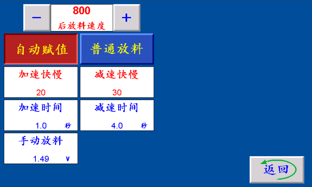 色标范围:制作彩色制品时,伺服(步进)电机以恒定的速度寻找色标点的范围(即色标光电在『长度—设定的色标范围长度』范围内寻找色标,寻至『长度+设定的色标范围长度』。 色标提前范围:制作彩色制品时,伺服(步进)电机在料送结束之前,提前以恒定的速度寻找色标。 打孔延时:送料结束后延时此参数设定的时间后打孔信号输出。 打孔时间:伺服(步进)电机转结束,打孔电磁阀工作的时间。 打孔2延时:送料结束后延时此参数设定的时间后打孔2信号输出。 打孔2时间:伺服(步进)电机转结束,打孔2电磁阀工作的时间。 拔针延时:一批结束后延时此参数设定的时间后拔针信号输出。 拔针时间:一批结束后延时“拔针延时”的时间后拔针信号输出,跟脱袋信号一起断开。 脱袋时间:一批结束后延时“拔针延时”加“拔针时间”的时间后脱袋信号输出,时间结束后跟拔针信号一起断开 横吹百分比:由输入点X01送料信号控制横吹信号输出,输出时间由此参数来设定调节。 竖吹时间:由输入点竖吹输入控制竖吹信号输出,时间由此参数来设定调节。 报警个数:一批结束前提前N个报警。 点动频率:停止状态下,X04(点动)收到信号时,Y07主机信号输出,切刀上下运行,速度由此参数调节。 二段速频率:主机运行时按停止键,主机切换成二段速停机,二段速速度由此参数调节。 点进速度:伺服(步进)电机的点进/点退时的速度,设定越大,伺服(步进)电机的转速越快。 寻标频率:伺服(步进)电机追色标时的速度,设定越大,伺服(步进)电机的转速越快。 外接启动延时:点击外接启动按钮时,持续该时间后主机开始启动。 脱标个数:设定N个,制作彩色制品时,跟踪N次色标点,跟踪不住自动停机。 送料延时:下一次送料时,延时送料延时时间后开始送料。 屏保时间:主机运行状态下,在主界面停留此时间进入屏保状态。(设置0则屏保无效) 合刀延时:放料关闭时,延时该时间后合刀关闭时间。 频率上限:伺服(步进)电机的最高转速,设定越大,伺服(步进)电机的转速越快。 步进慢速/步进快速/伺服慢速/伺服快速:设置电机的脉冲曲线,步进曲线对应的整圈步数默认为600步,伺服曲线对应的整圈步数默认为2000步。 主机系数:控制主机速度快慢。 主机修正手动/主机修正自动: 主机修正手动:手动调节主机系数来改变主机速度 主机修正自动:自动修正好主机速度对应的主机系数大小。 六、放料设置界面