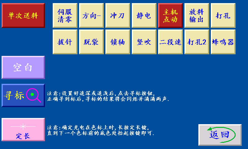 寻标:当‘寻标’键选择“深色/浅色”时按此键,伺服(步进)电机一直转到深色的色标点自动停转时,设置为“追深”;伺服(步进)电机一直转到浅色的色标点自动停转时,设置为“追浅。