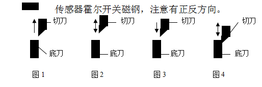 八、输入传感器逻辑关系图 A ,开始送料位置,此时切刀向上运动,刚离开底刀,步进电机可顺利地将被制料送出(图1)。 B, 高位停机位置,此时切刀向上运动,至最高点,停机,可使烫切刀不致于破坏被制料(图2)。 C ,拖料极限位置,此时切刀向下运动,刚到底刀处,此时步进电机不能再送料,否则,被制料会堵于刀内或拉断(图3)。