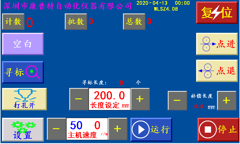 三、主页 长度设定:显示制袋所设定长度,单位:毫米(也可以当按键直接调节长度) 补偿长度:每隔一次送料,制袋所设定长度加补偿长度作为补偿,单位:毫米 主机速度:控制主机加减速快慢。 计数/清零:单批次累计到一批个数结束时,个数自动归零;按“计数/清零”键清零清个数。 批数/清零:一批结束后,批数加“1”, 总数/清零:个数每加一个,总数加“1”;按“总数/清零”键清零总数。 空白/深色/浅色:三种状态切换。 空白:指光电忽略色标光电传感器信号; 深色:指跟踪印刷制品时,以深颜色的色标点为跟踪点; 浅色:指跟踪印刷制品时,以浅颜色的色标点为跟踪点。 寻标:当‘寻标’键选择“深色/浅色”时按此键,伺服(步进)电机一直转到深色的色标点自动停转时,设置为“追深”;伺服(步进)电机一直转到浅色的色标点自动停转时,设置为“追浅。 当‘寻标’键选择“空白”时,按此键无效 点进:在停止状态下,手动伺服(步进)电机正转。 点退:在停止状态下,手动伺服(步进)电机反转,在运行状态下此键变为“补数”,按此键计数减1。 复位:系统不能正常工作时,按此键程序重新启动,也可以做紧急?;谩?/span> 运行:按此键,主机正常运行。(长按3秒左右) 停止:按此键,霍尔开关GK1检测到高位停机信号;主机自动?;?。 状态显示:运行/停止/超速/暂停/脱标/完料,六种状态切换显示。 运行:按启动键后显示“运行”。 停止:通电后一直显示“停止”。
