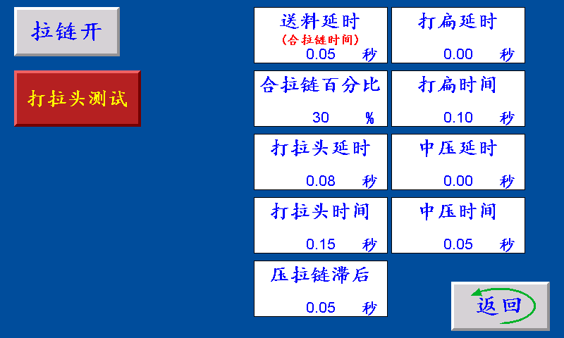 八、上拉头设置界面 送料延时:下一次送料时,延时送料延时时间后开始送料。 合拉链百分比:由输入点X01送料信号控制合拉链信号输出,输出时间由此参数来设定调节。 打扁延时:送料结束后延时此参数设定的时间后打扁信号输出。 打扁时间:伺服(步进)电机转结束,打扁电磁阀工作的时间。 中压延时:送料结束后延时此参数设定的时间后中压信号输出。 中压时间:伺服(步进)电机转结束,中压电磁阀工作的时间。 打拉头延时:送料结束后延时此参数设定的时间后打拉头信号输出。 打拉头时间:伺服(步进)电机转结束,打拉头电磁阀工作的时间。