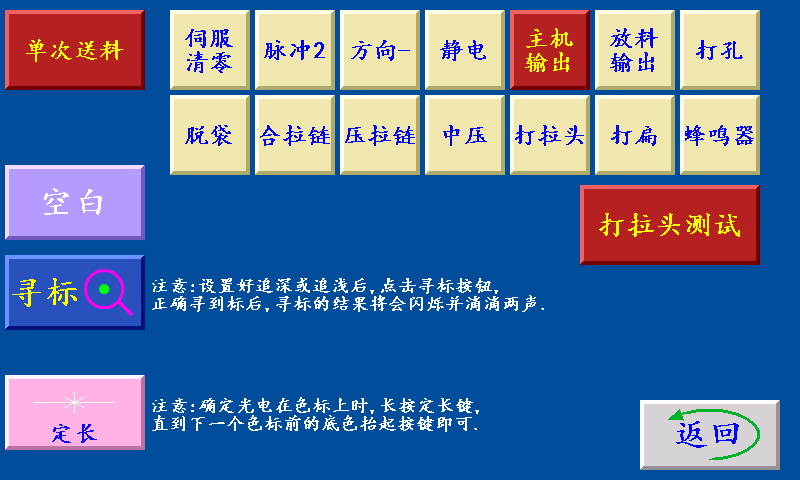 单次送料:停机状态下,点击此键,送一次料后停止。 寻标:当‘寻标’键选择“深色/浅色”时按此键,伺服(步进)电机一直转到深色的色标点自动停转时,设置为“追深”;伺服(步进)电机一直转到浅色的色标点自动停转时,设置为“追浅。 当‘寻标’键选择“空白”时,按此键无效