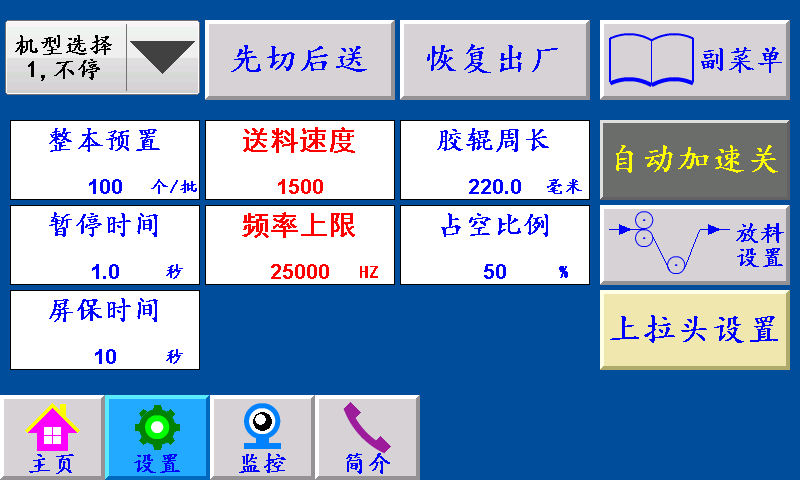 四、设置 不停/暂停/停机:“不停”:一批结束主机不停,继续正常工作。 “暂停”:一批结束主机暂停,停到暂停时间结束,主机自动开机。 “停机”:一批结束主机自动停机后不再运行,手动按启动键方可运行。 先切后送/先送后切:“先切后送”:按启动键,主机先运行,GK1霍尔开关检测到伺服(步进)电机的送料信号,伺服(步进)电机开始送料。 “先送后切”:按启动键,伺服(步进)先送料,送料结束后主机再运行。 放料设置:点击此键进入放料设置界面。 屏保时间:主机运行状态下,在主界面停留此时间进入屏保状态。(设置0则屏保无效) 恢复出厂:按此键恢复出厂设置(慎用)。 副菜单:点击此键进入副菜单界面。 整本预置:一批设定的个数,提前5个报警。单位:个 暂停时间:当机型选择暂停,一批结束后主机自动停机所设定的时间。 送料速度:伺服(步进)电机的加减速时间,设定越大,伺服(步进)电机起步越快。 频率上限:伺服(步进)电机的最高转速,设定越大,伺服(步进)电机的转速越快。 胶辊周长:伺服(步进)电机带动橡胶辊转一圈的长度。 占空比例:“自动送料”时,主机运行一个周期送料所占的时间比例。 打孔开/关:控制是否需要输出打孔信号。 自动加速关/自动加速开: 自动加速关:自己调节送料速度 自动加速开:根据设定的袋长等自动调节送料速度