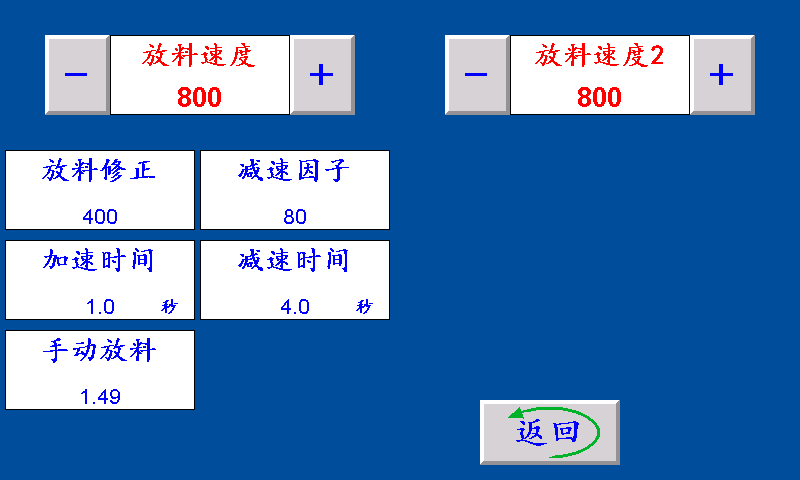 后放料速度:控制后放料电机的转速快慢。 手动放料:停机状态下,手动放料的速度。 放料修正:控制后放料电机的加减速快慢,设定值越小越快。 放料系数:控制后放料速度加减变化的当量。 加速时间:主机启动后,后放料起步加速到最高速所需的时间。 减速时间:主机停止后,后放料从最高速减到最低速所需的时间。