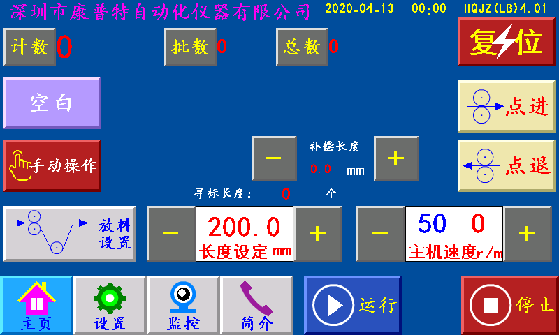 状态显示:运行/停止/超速/暂停/脱标/完料,六种状态切换显示。