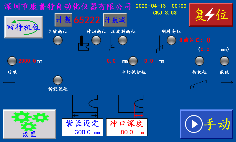 三、主页 ![]() 袋长设定:显示制袋所设定长度,单位:毫米 冲口深度:显示袋子冲切的深度,单位:毫米 计数/清零:单批次累计到一批个数结束时,个数自动归零;按“计数/清零”键清零清个数。 计数减:点击此键,计数值减1。 回待机位:点击此键机械手回到待机位。 复位:系统不能正常工作时,按此键程序重新启动,也可以做紧急停机用。 手动/自动:手动:手动状态时,进行手动测试。 自动:自动状态时,遇到脱袋信号机械开始运行。