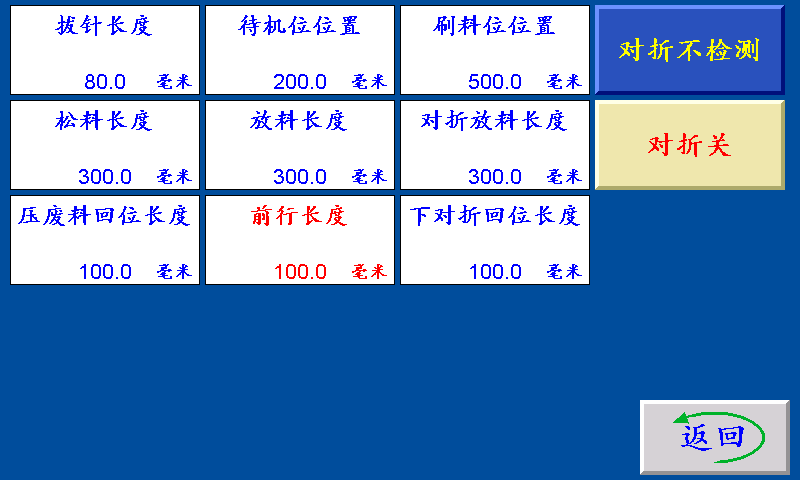 拔针长度:机械手从前行长度位置移动到冲切位位置时,经过拔针长度时拔针信号关闭。 待机位位置:正常运行时,机械手等待的位置。 刷料位位置:机械手往冲切位移动时,经过刷料位位置,刷料信号输出。 松料长度:机械手开夹后,后退松料的长度。 放料长度:机械手后退放料的长度。 对折放料长度:上对折和下对折信号输出后,机械手后退放料长度。 压废料回位长度:机械手在冲切位后退时经过压废料回位长度,压废料信号关闭。 前行长度:运行时,遇到脱袋信号,机械手从待机位向前移动的距离。 下对折回位长度:机械手对折抓料后,后退该长度时下对折信号关闭。 对折不检测/对折检测: 对折不检测:没有上对折高位和下对折低位霍尔时,不需要对折检测,同时不进行对折动作。 对折检测:有上对折高位和下对折低位霍尔时,必须切换为对折检测。 对折关/对折开: 对折关:机械不进行对折动作。 对折开:在对折检测时,机械才可进行对折动作。
