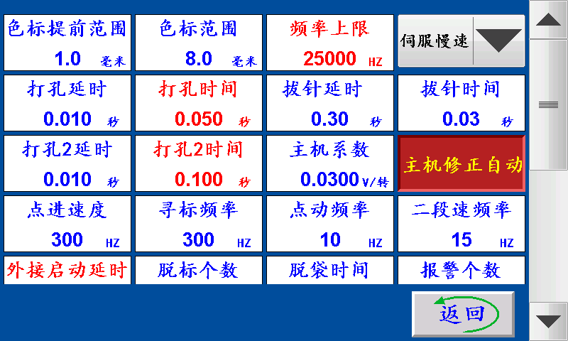 色标范围:制作彩色制品时,伺服(步进)电机以恒定的速度寻找色标点的范围(即色标光电在『长度—设定的色标范围长度』范围内寻找色标,寻至『长度+设定的色标范围长度』。 色标提前范围:制作彩色制品时,伺服(步进)电机在料送结束之前,提前以恒定的速度寻找色标。 打孔延时:送料结束后延时此参数设定的时间后打孔信号输出。 打孔时间:伺服(步进)电机转结束,打孔电磁阀工作的时间。 打孔2延时:送料结束后延时此参数设定的时间后打孔2信号输出。 打孔2时间:伺服(步进)电机转结束,打孔2电磁阀工作的时间。 拔针延时:一批结束后延时此参数设定的时间后拔针信号输出。 拔针时间:一批结束后延时“拔针延时”的时间后拔针信号输出,跟脱袋信号一起断开。 脱袋时间:一批结束后延时“拔针延时”加“拔针时间”的时间后脱袋信号输出,时间结束后跟拔针信号一起断开 横吹百分比:由输入点X01送料信号控制横吹信号输出,输出时间由此参数来设定调节。 竖吹时间:由输入点竖吹输入控制竖吹信号输出,时间由此参数来设定调节。 报警个数:一批结束前提前N个报警。 点动频率:停止状态下,X04(点动)收到信号时,Y07主机信号输出,切刀上下运行,速度由此参数调节。 二段速频率:主机运行时按停止键,主机切换成二段速停机,二段速速度由此参数调节。 点进速度:伺服(步进)电机的点进/点退时的速度,设定越大,伺服(步进)电机的转速越快。 寻标频率:伺服(步进)电机追色标时的速度,设定越大,伺服(步进)电机的转速越快。 外接启动延时:点击外接启动按钮时,持续该时间后主机开始启动。 脱标个数:设定N个,制作彩色制品时,跟踪N次色标点,跟踪不住自动停机。 送料延时:下一次送料时,延时送料延时时间后开始送料。 屏保时间:主机运行状态下,在主界面停留此时间进入屏保状态。(设置0则屏保无效) 合刀延时:放料关闭时,延时该时间后合刀关闭时间。 频率上限:伺服(步进)电机的最高转速,设定越大,伺服(步进)电机的转速越快。 步进慢速/步进快速/伺服慢速/伺服快速:设置电机的脉冲曲线,步进曲线对应的整圈步数默认为600步,伺服曲线对应的整圈步数默认为2000步。 主机系数:控制主机速度快慢。 主机修正手动/主机修正自动: 主机修正手动:手动调节主机系数来改变主机速度 主机修正自动:自动修正好主机速度对应的主机系数大小。 六、放料设置界面