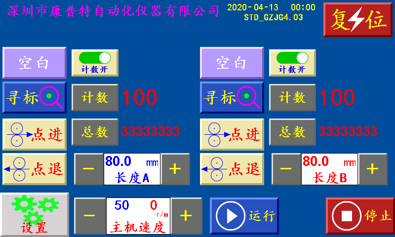 三、主页 长度设定:显示制袋所设定长度,单位:毫米(也可以当按键直接调节长度) 主机速度:控制主机加减速快慢。 计数开/计数关:控制每次送料是否需要计数。 计数/清零:单批次累计到一批个数结束时,个数自动归零;按“计数/清零”键清零清个数。 批数/清零:一批结束后,批数加“1”, 总数/清零:个数每加一个,总数加“1”;按“总数/清零”键清零总数。 空白/深色/浅色:三种状态切换。 空白:指光电忽略色标光电传感器信号; 深色:指跟踪印刷制品时,以深颜色的色标点为跟踪点; 浅色:指跟踪印刷制品时,以浅颜色的色标点为跟踪点。 寻标:当‘寻标’键选择“深色/浅色”时按此键,伺服(步进)电机一直转到深色的色标点自动停转时,设置为“追深”;伺服(步进)电机一直转到浅色的色标点自动停转时,设置为“追浅。 当‘寻标’键选择“空白”时,按此键无效 点进:在停止状态下,手动伺服(步进)电机正转。 点退:在停止状态下,手动伺服(步进)电机反转,在运行状态下此键变为“补数”,按此键计数减1。 复位:系统不能正常工作时,按此键程序重新启动,也可以做紧急停机用。 运行:按此键,主机正常运行。(长按3秒左右) 停止:按此键,霍尔开关GK1检测到高位停机信号;主机自动停机。 状态显示:运行/停止/切刀降速/暂停/脱标/完料,六种状态切换显示。 运行:按启动键后显示“运行”。 停止:通电后一直显示“停止”。 切刀降速:主机速度过快步进(伺服)电机送料还没有结束时,主机停机显示“切刀降速”。 暂停:当机型选择“暂停”时一批结束停机N秒后主机自动开机。 脱标:在制作印刷制品时没有跟踪到色标点显示“脱标”。 完料:当主机运行,X15检测到断料信号时,蜂鸣器报警,主机停机,显示故障“完料”。主机停止状态下X15检测到完料信号时,蜂鸣器报警,显示故障“完料”。(按“停止”清除故障)