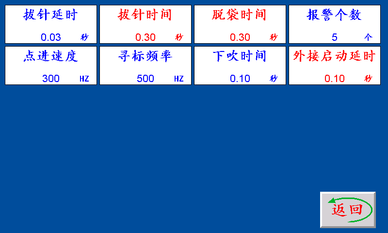 五、副菜单 拔针延时:一批结束后延时此参数设定的时间后拔针信号输出。 拔针时间:一批结束后延时“拔针延时”的时间后拔针信号输出,跟脱袋信号一起断开。 下吹时间:由输入点下吹输入控制下吹信号输出,时间由此参数来设定调节。 脱袋时间:一批结束后延时“拔针延时”加“拔针时间”的时间后脱袋信号输出,时间结束后跟拔针信号一起断开。 报警个数:一批结束前提前N个报警。 点进速度:伺服(步进)电机的点进/点退时的速度,设定越大,伺服(步进)电机的转速越快。 寻标频率:伺服(步进)电机追色标时的速度,设定越大,伺服(步进)电机的转速越快。 点动频率:停止状态下,X04(点动)收到信号时,Y07主机信号输出,切刀上下运行,速度由此参数调节。 二段速频率:主机运行时按停止键,主机切换成二段速停机,二段速速度由此参数调节。 外接启动延时:点击外接启动按钮时,持续该时间后主机开始启动。