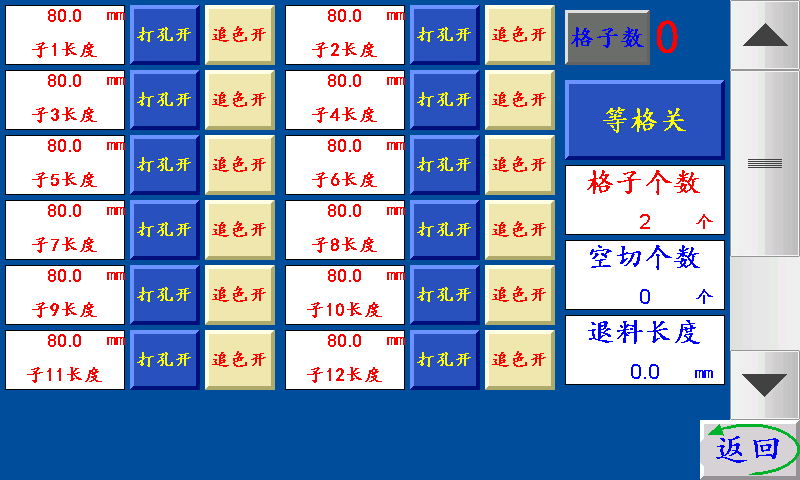 七、跳袋功能界面 格子长度:每个格子的长度设定 打孔开关:每次送完对应格子是是否需要打孔的开关 追色开关:每次送完对应格子是是否需要寻标的开关 格子个数:一个材料所需要送的格子个数。 空切个数:送完所有格子后主机进行空切的个数。 退料长度:停机的时候,格子空切完成后进入空切状态。 等格开关: 等格开:所有格子数长度都为格子1的长度。